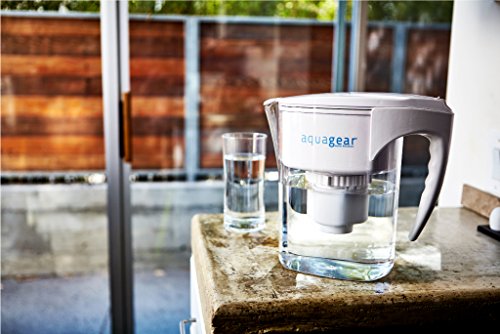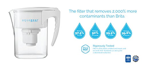 -. Feature : ✓ PREMIUM DESIGN FOR HEALTH AND SUSTAINABILITY. Filter made in USA, 100% BPA-free, 100% FDA-approved food grade materials, 100% recyclable, 100% vegan. / ✓ RIGOROUSLY TESTED. Filter is EPA/ANSI certified and meets and exceeds NSF Standards 42 and 53 for contaminant reduction. Aquagear holds 2016 Water Quality Association (WQA) membership. Filter tested in Flint, Michigan for lead and copper reduction. / ✓ TRIPLE CAPACITY FILTERS. High quality filters produce 150 gallons of water each, lasting 3 times longer than Brita filters and 4 times longer than ZeroWater for maximum lifetime savings. / ✓ REMOVES 2000% MORE CONTAMINANTS THAN BRITA, INCLUDING FLUORIDE, LEAD, CHROMIUM 6, CHLORAMINES, MERCURY, AND CHLORINE. A five stage filter with 2 micron pores, including a lead/fluoride filter, protects you and your family from contaminants that other filters miss. The filter does all this while keeping healthy trace minerals like calcium and magnesium in your water, which ZeroWater and Reverse Osmosis systems will strip out. / ✓ LIFETIME GUARANTEE AND SAME-DAY CUSTOMER SUPPORT. If your filter pitcher ever breaks, we will replace it free of charge. We are entirely dedicated to keeping you satisfied, hydrated, and healthy.