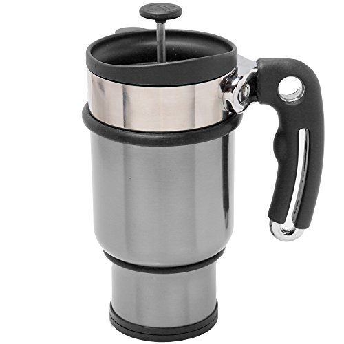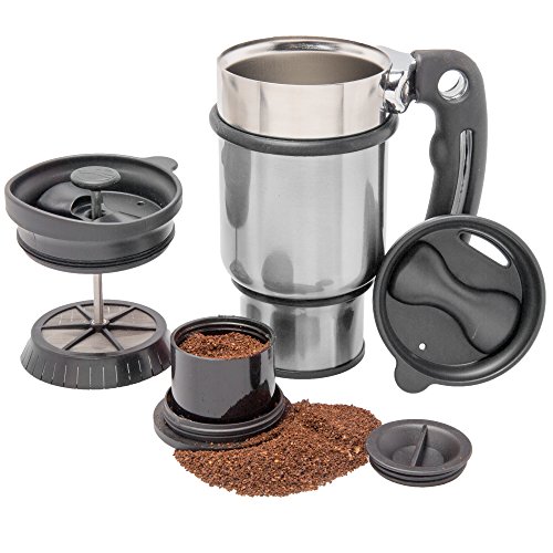 18/8 marine grade stainless steel Retains heat for extended periods of time Patented double filtration system creats perfect brew of coffee or tea. No need to pour into a separate container, you can drink right from the pot.Designed specifically for the commuter Fits most vehicle drink holders Includes a built-in storage container in the bottom to carry enough coffee or tea to brew 2 more cups (see illustration below)Essential tool for an outdoor enthusiast or professional on the runAdditional lid included to convert the press into a conventional mugAdditional Lid features open/closed feature to keep your hot beverage hot for long durationAmbidextrous design works well for left handed usersCapacity 14 oz .