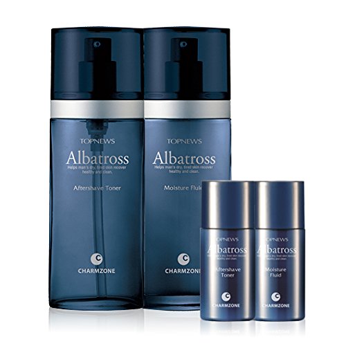 Charmzone Topnews Albatross 2 Kind Set for Men includes in box: Aftershave Toner (130ml), Moisture Fluid (130ml), and 2 free gifts: travel sizes of both (25ml each).