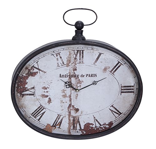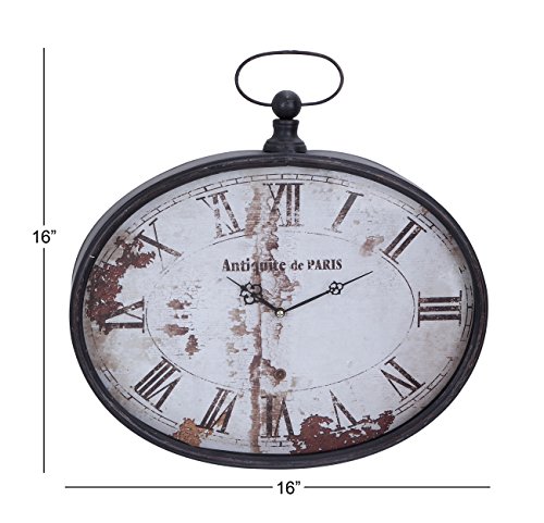 16 inch Paris inspired antique reproduction oval wall clock, wrought iron case, ball finial and hanging loop, distressed white dial with black Roman numerals, hands and graphics. This product is manufactured in China.Feature