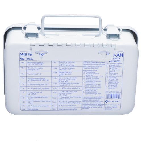 -. Feature : Case Material - Metal / Catalog Publishing Type - First Aid Kits-Standard / Compliance, Standards - Meets or exceeds OSHA Requirements, ANSI Z308.1-2003 standards / Contains - Antiseptic Towelettes, Bandages, Burn Relief, Cold Compress, Compresses, Exam Gloves, First Aid Guide, First Aid Tape, Gauze Pads, Triangular Sling Bandage / Coupon Cannon - 05-14-09