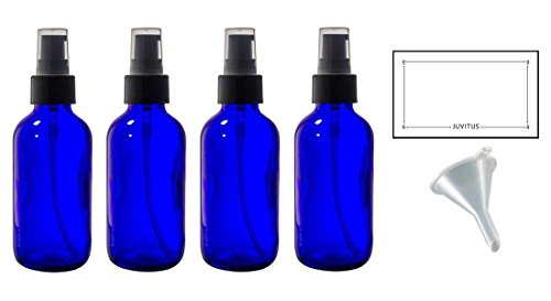 4 oz Cobalt Blue Glass Boston Round Treatment Pump Bottle (4 pack) + Funnel and Labels for essential oils, aromatherapy, food grade, bpa free