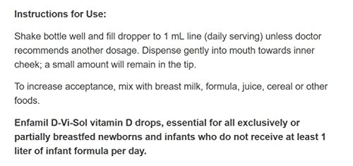 Enfamil D-Vi-Sol Liquid Vitamin D Supplement. No.1 Vitamin drops brand recommended by pediatricians. For all breastfed infants. D-Vi-Sol has vitamin D that helps your baby's body absorb calcium for strong bones and teeth. Contains no artificial colors or flavors.Feature