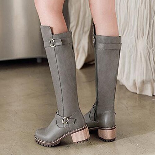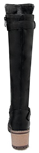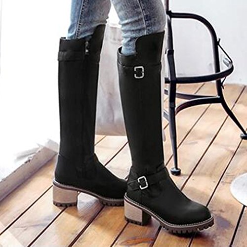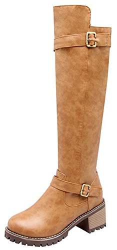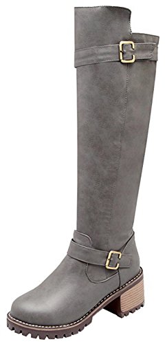 (Mofri)/Women's/Boots/DIRECT FROM USA/Mofri Women's Unique Buckle Strap Stacked Chunky Medium Heel Round Toe Side Zipper Under The Kn...