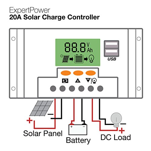ExpertPower 20A 12/24V 240/480W Intelligent PWM Solar Charge Controller with Adjustable Timer Control Mode, USB Ports, and LCD Display