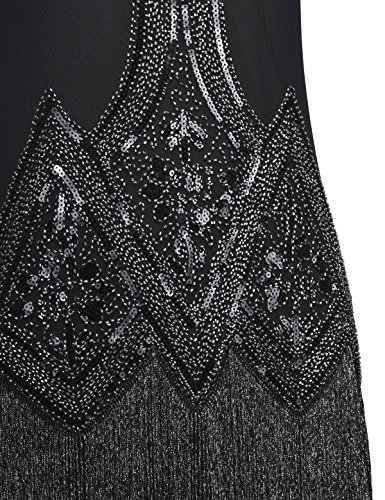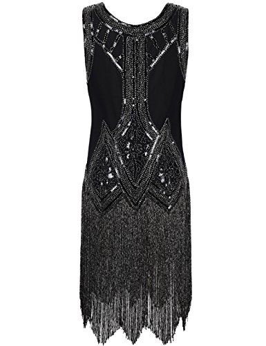 This black dress is another respect of the 1920s ,low-key , elegant ,but not ordinary at all.Embellished with large quantity of metal beads,several sequins,and black tassel which interspersed with gold line,express the visual beauty.This dress mixed with modern and vintage, originality and inspiration, passion and sagaciousness.Its modern stylish twist and true inspiration to the Vintage Sensation inspired everyone.Feature