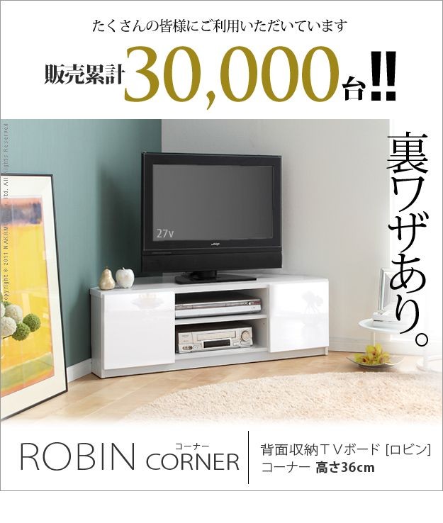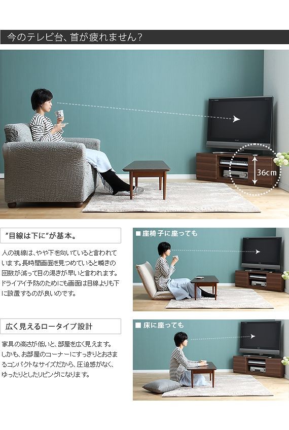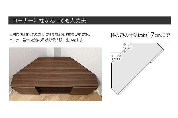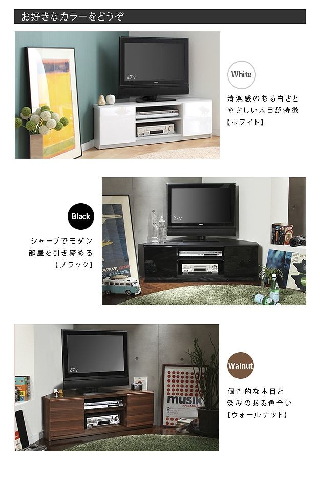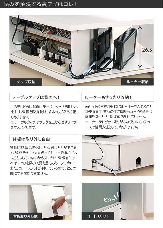 商品について:背面収納タイプのコーナーTVボード。テレビをコーナーに置くことで部屋のスペースを有効利用でき、部屋中どこからでも見やすい♪背面にテーブルタップを収納できるのでコード類の扱いも簡単☆前後に動くキャスター付きで配線作業、お掃除はラクラク。天板耐荷重50kg、テレビサイズ目安37V型まで