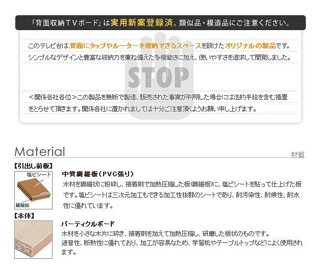 材質:本体-プリント紙化粧パーティクルボード(木目タイプ)、前板-合成樹脂化粧繊維板