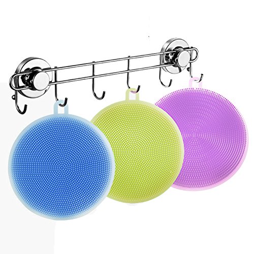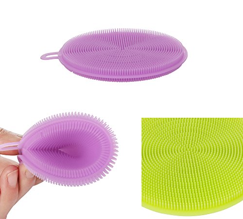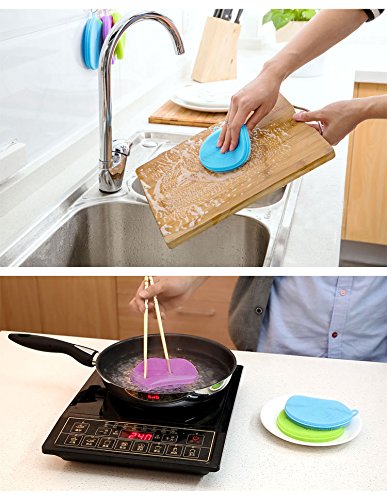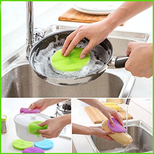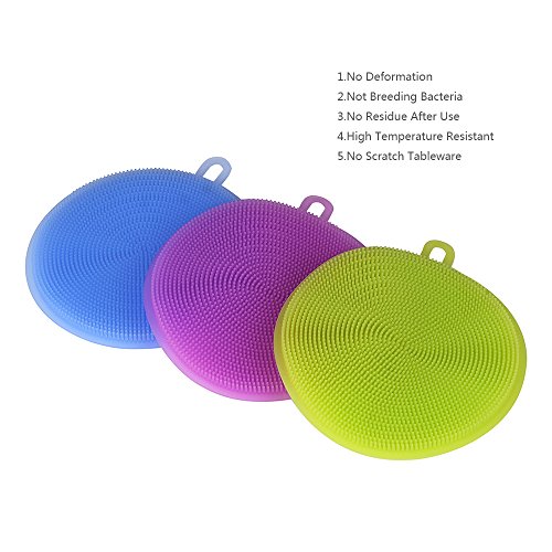Silicone Scrubber Clean Dishwashing Brush Antibacterial Non Stick Multi-Purpose Kitchen Tool for Fruit Vegetable Dish Pot Pan Set of 3, Blue, Green and Purple 4.5 inch x 4.5 Inch