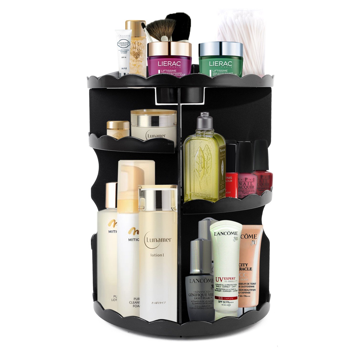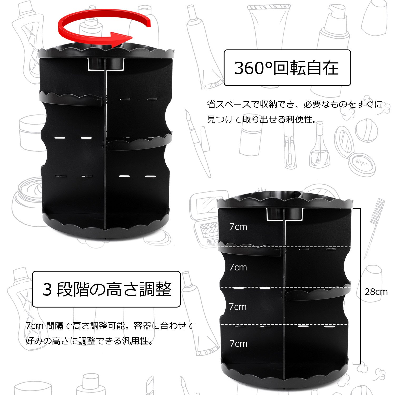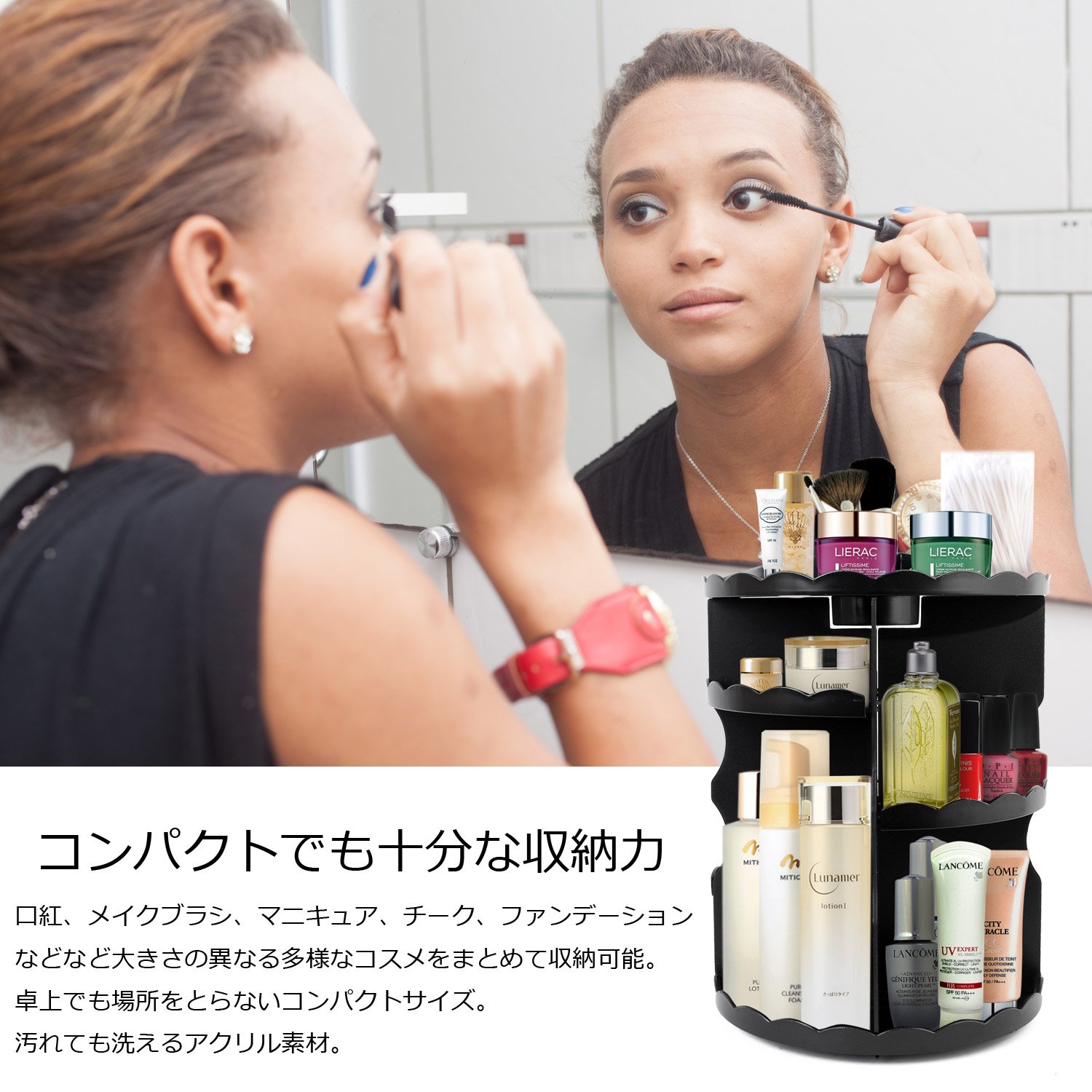 We recommend rotating type cosmetic box which can store easily and cleanly even containers of different sizes.