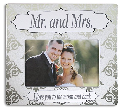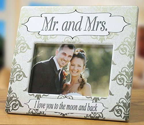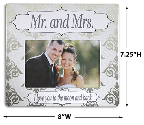 - WEDDING FRAME. Mr. & Mrs. Wedding Photo Picture Frame with the words, I Love You to the Moon and Back. Elegant silver and white design goes with any wedding photo. Perfect picture frame to display your favorite wedding photo in. Set it on your desk, bookshelf, mantel, counter, night stand, dresser, wall shelf, entry way, wedding reception, bridal shower, wedding decorations or sofa table. Use it on the gift table with an engagement picture in it as a wedding decoration.