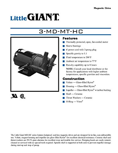 Little Giant 578603 3-MD-MT-HC 1/25 HP, 500 GPH @ 1' - Magnetic Drive Pump, 6' Power Cord