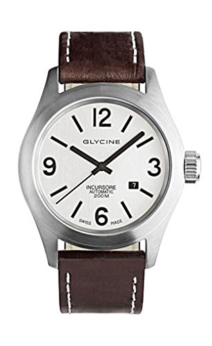Studio : Glycine Publisher : Glycine Binding : Watch Product Description Established in Bienne, Switzerland in 1914, Glycine has maintained through the years a select line of timepieces, based on the strong foundations of the brand and reflecting their times. Glycine Incursore Stainless Steel Mens Automatic Swiss watch Model# 3874.11 LB7BF / 3874-11-LB7BF. The watch case is crafted from Sandblasted stainless steel 316L and is presented on the dark brown genuine leather strap, Silver dial set with black hand indicators, Arabic Numeral index hour markers, Date display at the 4 o'clock position, Scratch Resistant Sapphire Crystal, Swiss Automatic self-winding movement, ETA 2824-2, Caliber No GL 224, 25 Jewels, 11 1/2' lines, 38 Hour Power Reserve, Hz: 4/28'800 vibrations per hour, Ruthenium coated oscillating weight on ball bearing decorated special Glycine engraving, Water resistant to 200 meters/660 feet. As all of our watches, this Glycine Incursore Gents watch is BRAND NEW, and comes in its original packaging with the warranty card and papers! 0