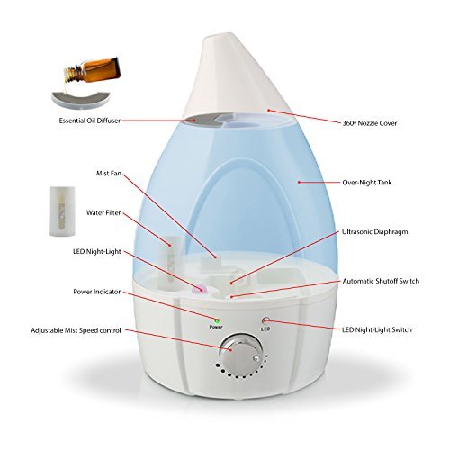 Lasts full night, 8 hours operation at highest mist speed, 3l - 0.79 gal, tank capacity. 300ml per hour, automatic shutoff, and easy to clean