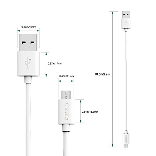 • What You Get: 2-Pack10.5ft/3.2m Extra Long White USB to Micro USB Cables.Extra Short, Extra Durable lengths let you connect at close proximity without getting tangled. 4000+ bend lifespan several times longer than standard cables.
