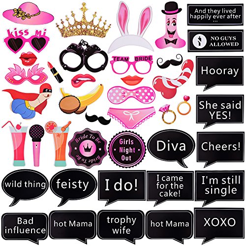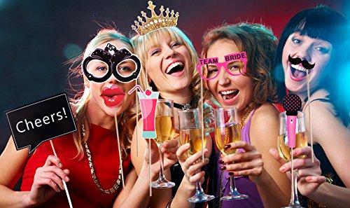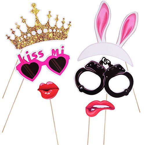 Package includes: 42 various dress up glasses, mustache and lips in bachelorette party theme, and bikinis, crowns, diamonds, etc. , innovative to bring fun to friends, adding your party atmosphere; with sticks and glue dots for diy.