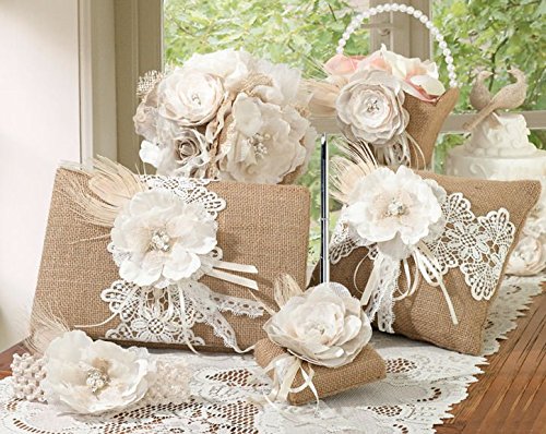 Studio : Lillian Rose Publisher : Lillian Rose Binding : Kitchen Product Description Add some charm to your wedding with this adorable Burlap and Lace Collection. All the items of this set feature burlap, lace, a natural brown peacock feather, and pearl and rhinestones accents. Set includes guestbook, pen set, garter, ring pillow, and flower basket. 0