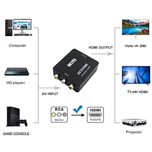 Studio : Wonlyus Publisher : Wonlyus Binding : Electronics Product Description RCA Composite AV CVBS to HDMI 1080P Audio Video Mini Converter It converts composite signal (from yellow, red, white cables) to HDMI signal works on a smart HDTV / HD monitor / HD projector, Upscale 720P / 1080P. It is a universal converter for analog composite input to HDMI(60HZ) output. The analog to digital conversion in this module employs 10 bits maximal 162MSPS sampling,black/white level expansion, color transition improvement, dynamic range expansion, blue stretch, auto-detect and auto-convert the composite signal to 1080p(60HZ) output. Making video come alive.