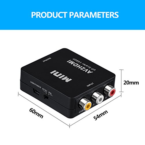 Specifications: Input port: 1xRCA (Yellow, White, Red) Output port: 1xHDMI Dimensions (mm): 66(D)x54(W)x20(H) Net weight (g): 40g Composite input: PAL, NTSC3.58, NTSC4.43, SECAM, PAL/M, PAL/N HDMI output :1080P (60HZ),720P(60HZ)