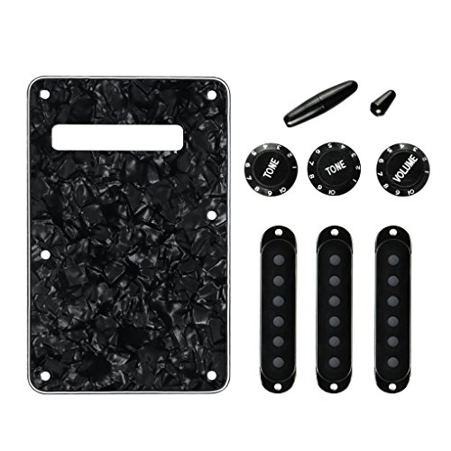 Studio : iknmusic Publisher : iknmusic Product Description Feature: * Set of Gutiar Back Plate, Pickup Covers, Knobs and Tips for Strat Style Gutiar or similar replacement.* All materials are environmentally friendly, thermostability, no smell. Multi-layer plates are pressed under high temperature and pressures, to make them close integration between each layer, will not appear curly, deformation, or separation of different layers.Two layers of protective films on the front of Back Plates, anti-scratch to protect the back plate.Specification:* Item: Back Plate Pickup Covers 2T1V Knobs 5 Way Switch Tip Tremolo Whammy Bar Tip.* Back Plate: L 145mm, W 93mm; Pickup Covers: 50/50/52mm Style; * Knobs: 2Pcs Tone and 1Pcs Volume Control Knobs; Switch tip: for 5 Way Strat Style Guitar switch or similar; Whammy Bar Tip: for Single Tremolo System normally* Material: Back Plate: Made of 4Ply, 3Ply PVC and 1Ply Pearl Celluloid Plate. Guitar Parts: Plastic PVC* Color: Back Plate: Black Pearl; Guitar Parts: Black.* Back Plate is with protective film on the surface, while using please split it off.* Note:Item's color might be different from the picture because of the aberration.Package Includes:1 x Back Plate50/52/52 Pickup Covers2T1V Knobs1 x Switch Tip1 x Bar Tip 0