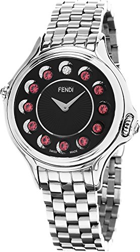 -. Feature : Polished stainless steel (38 mm in diameter, 10 mm thick), screw-in case-back partially see-through to view the rolling mechanism, black guilloche dial, silver-tone hands, diamond hour marker at the 12 o'clock position, unique rolling gemstone mechanism that changes the 11 semiprecious hour markers to white topaz, pink topaz or rainbow topaz by turning the crown on the right side of the case / Scratch resistant sapphire crystal, crowns set with sapphire cabochons, Swiss quartz movement, water resistant to 3 M/30 M/99 feet, polished stainless bracelet, push button deployment clasp, F107031000T05 number: F107031000T05 / Swiss-quartz Movement / Case Diameter: 38mm / Water Resistant To 99 Feet