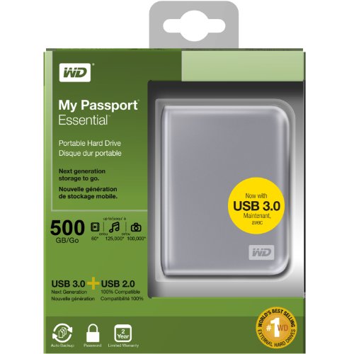 -. Binding : Personal Computers -. Brand : Western Digital -. Label : Western Digital -. Manufacturer : Western Digital -. NumberOfItems : 1 -. PackageQuantity : 1 -. ProductGroup : CE -. ProductTypeName : COMPUTER_DRIVE_OR_STORAGE -. Publisher : Western Digital -. Studio : Western Digital -. Title : Western Digital My Passport Essential 500 GB USB 3.0 and USB 2.0 Portable External Hard Drive
