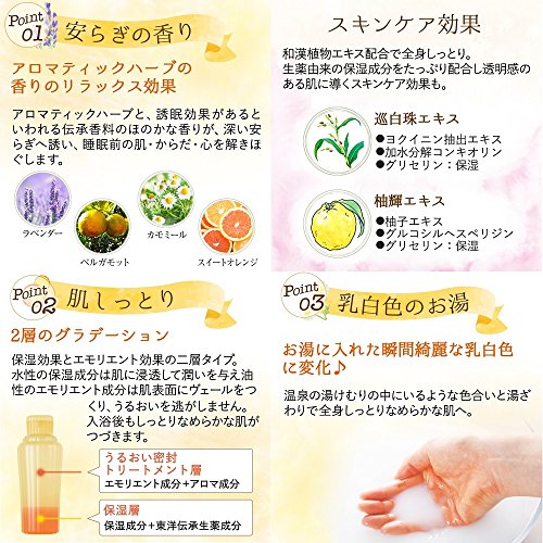 충분히 윤택한 성분이,촉촉한 매끄러운 투명감이 있는 피부(기)에 이끄는 스킨 케어 입욕 제.유연함(부드러움) 일까탕 같은 느낌과,유면 효과가 있다고 하는 전승 향료가 은은한 향기가 깊은 편안함에 권하고, 수면 전의 기질몸심을 풉니다.아로마 T《구하부》의 향기에,휴식 전의 사람시에 깊은 평안감을 가져옵니다.순백주엑기스(《요쿠이닌》추출 엑기스,가수분해 콘《기오린》,글리세린:보습)고, 유자나무휘(유기)엑기스(카슈가르(유자) 엑기스,《구루코시루헤스페리진》,글리세린:보습)배합