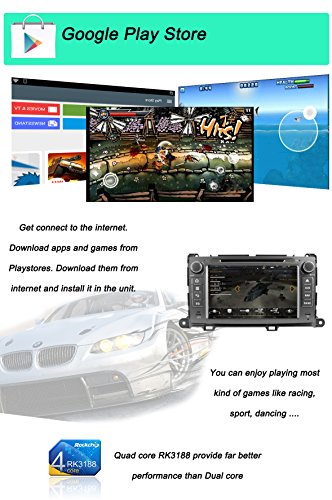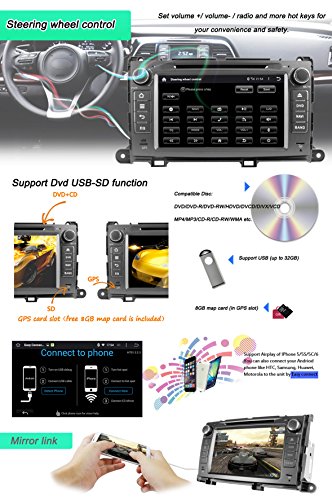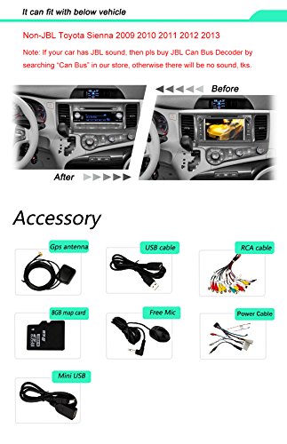 - Feature : The plug and play in-dash vehicle gps units only fit to Non-JBL Toyota Sienna 2009 2010 2011 2012 2013 2014, if your car has JBL sound system, then you need to buy a Can Bus decoder to decode the sound, otherwise there will be no sound, search "Can Bus" in our store and add to cart thanks / Loaded with pure Android 4.4.4 Kitkat, RK3188 1.6GHz Cortex A9 Quad Core CPU, Samsung DDR3 1GB RAM and 16GB flash memory, Mali 400MP GPU; Adopts Capacitive Digital 1024*600 HD screen, multi-touch, 175 viewing angle, day and night readable / Built-in GPS navigation; Bulit-in Bluetooth for hands-free calling and phone music playing; Support OBD2, AV-IN reverse camera, Digital Video Recorder, Steeing Wheel Control; Built-in WiFi, 3G and hotspot / Support iphone 4s 5 5c 5s 6 Airplay, Android phone Mirror link; 30 stations of analog AM/FM RDS radio; Support iPhone audio input, Play music or video via SD card or USB; Support Dual Zone function; Support 1080P video and 3D game; Support subwoofer and EQ, 4*50W power output / Free external and Free map in a Free 8GB map card; 12 months warranty for quality-related issues;