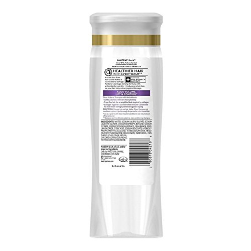 -. Binding : Misc. -. Brand : Pantene -. EAN : 0641361602283 -. Feature : Gently Cleans with zero heavy build-up / Preps hair for an voluminous with a plumping effect inspired by collagen; You have fine, flat hair that lacks body and you want a lush, amplified volume style. / Silicone-Free Shampoo; Micro-boosters prepare fine hair?s structure to hold voluminous Styles all day -. Label : Unknown -. Manufacturer : Unknown -. MPN : 080878042166 -. PackageQuantity : 3 -. PartNumber : 080878042166 -. ProductGroup : Health and Beauty -. ProductTypeName : HEALTH_PERSONAL_CARE -. Publisher : Unknown -. Studio : Unknown -. Title : Pantene Pro-V Sheer Volume With Collagen Plumping Effect Shampoo 12.60 Oz (Pack of 3) -. UPC : 641361602283