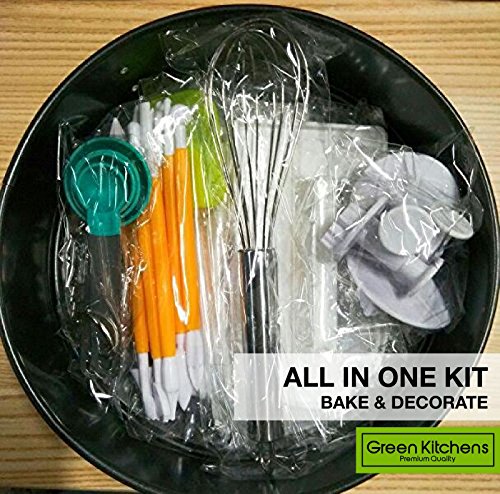 Studio : Green Kitchens® Publisher : Green Kitchens® Product Description In Your Free Pack You will Get...All in One Pack!!! Everything you need to Bake Decorate a Cake for Beginner to Professional Baker. This Pack has got ALL the essentials, 4 different sizes measuring spoons, 8 decorating pens with 16 designs, 3 sizes butterfly molds, spatula, baking pan, piping bag with 8 different designed nozzles, whisker fondant smoother!!! 8 Lovely Designed Cake Decorating Pens each double sided giving you 16 different and extreme precision decorating. All 100% dishwasher safe! 4 Different Sizes Multi functional Measuring Spoons with easy to read markings. Best for Flour or Sugar. 100% Dishwasher Safe! 8 Stainless Steel Icing Nozzles with Each one uniquely designed for best results! Nozzles come with large reusable pastry bag and coupler! You also get, 9-inch Non Stick Baking Pan with easy release clip, Cake Fondant Smoother with comfortable hand-grip, Flexible but Firm Spatula, Quality Whisker and 3 butterfly molds with press out function! and not only that with each purchase you get Green Kitchens 'Bake A Cake Recipe Book' consisting Top 20 Baking Recipes only Exclusively for you! 0