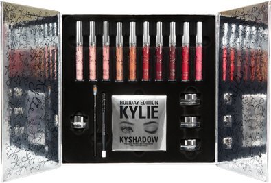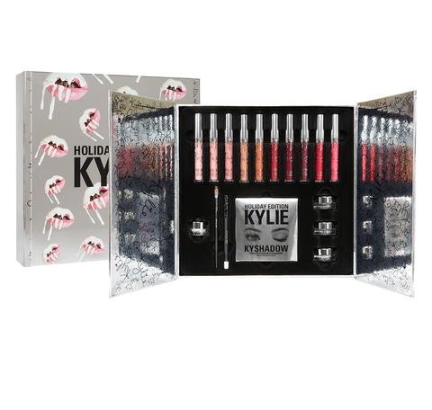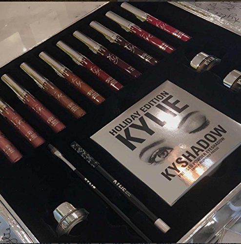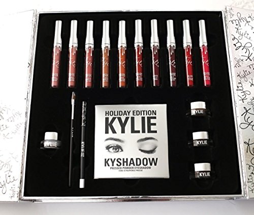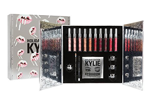 8 Full-Size Matte Liquid Lipsticks (0.11fl oz./oz. liq / 3.25ml each) in the following shades: Koko K (pale pink) Candy K (soft, warm nude) Angel (warm, pinky nude) Brown Sugar (true yellow brown) Pumpkin (dirty mid-tone orange) Merry (deepened rich red) Vixen (blackened vampy plum) Okurrr (vibrant fuschia) 2 Full-Sized Glosses (0.11 fl oz./oz. liq / 3.00ml each) in the following shades: Jolly (blackened burgundy) Naughty (true bright red) 1 Kyshadow Holiday Palette (net weight / pods net 9 X 1.40 grams / 9 X 0.05 oz) containing the following shades: Sugar Cookie (matte finish creamy warm nude) Frosty (metallic finish platinum silver) Chestnut (matte finish muted dusty mauve) Mittens (metallic finish deepened mahogany red) Winter (metallic finish shimmering denim blue) Nutcracker (metallic finish silvery plum) Gingerbread (metallic finish shimmering silver bronze) Evergreen (matte finish deep teal green) Silent Night (matte finish blackened plum) 1 Kyliner Kit in Snow (crisp matte white), containing: 1 Snow Crème Gel eyeliner (0.11 fl oz./ 4.00 grams) 1 Snow Pencil Eye Liner (net wt./ poids net .04 oz./ 1.2g) 1 full sized synthetic small angled brush 3 Crème Shadows (0.18 fl oz./ 5.00 grams each) in the following shades: Camo (shimmering forest green) Golden Plum (mauve purple with gold shimmer) Yellow Gold (bright gold with yellow)
