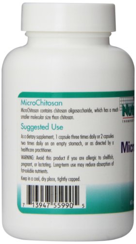 Studio : Nutricology Publisher : Nutricology Binding : Health and Beauty Product Description MicroChitosan contains nano-size particles of chitosan. The small particle size increases the surface area which enables better absorption of fat soluble compounds. Suggested Use: As a dietary supplement, 1 capsule three times daily or 2 capsules two times daily on an empty stomach, or as directed by a healthcare practitioner.;WARNING: Avoid this product if you are allergic to shellfish, pregnant or lactating. If used long-term, additional supplementation with fat soluble vitamins and essential fatty acids is recommended. Other ingredients: Hydroxypropyl methylcellulose, L-leucine.;These nutrients are of the highest quality and purity obtainable, and do not contain preservatives, diluents, or artificial additives.;Keep in a cool, dry place, tightly capped. 0