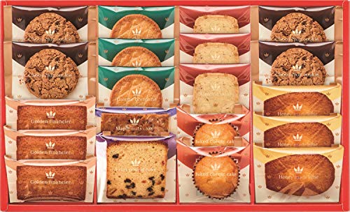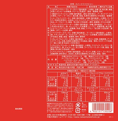 原材料:<はちみつマドレーヌ>マーガリン(国内製造)、小麦粉、砂糖、卵、転化糖、蜂蜜、洋酒、レモンピール砂糖漬、クリーム(乳製品)、食塩/膨脹剤、香料<黄金のフィナンシェ>砂糖(国内製造)、卵白(卵を含む)、アーモンドプードル、小麦粉、バター、マーガリン、転化糖、食塩、乳等を主要原料とする食品/膨脹剤<メープルウォールナッツカップケーキ>液卵(国内製造)、砂糖(国内製造)、小麦粉、マーガリン(乳成分を含む)、水あめ、ショートニング、メープルシロップ、アーモンド、くるみ、メープルソース、食塩/乳化剤(大豆由来)、香料、膨脹剤、カラメル色素<フルーツパウンドケーキ>小麦粉(国内製造)、砂糖(国内製造)、マーガリン(乳成分を含む)、卵、オレンジピール砂糖漬、レーズン、加糖卵黄、転化糖、ショートニング、チェリー砂糖漬、洋酒、食塩、シナモン/乳化剤(大豆由来)、膨脹剤、コチニール色素、香料<ベイクドチーズケーキ>砂糖(国内製造)、マーガリン(国内製造)、小麦粉、卵、ナチュラルチーズ、プロセスチーズ、レモンピール砂糖漬、乳等を主要原料とする食品、蜂蜜、食塩/膨脹剤、香料、酸味料<ガレットブルトンヌ>小麦粉(国内製造)、マーガリン、砂糖、加糖卵黄、アーモンドプードル、洋酒、乳等を主要原料とする食品、食塩/香料、カロテノイド色素、(一部に小麦・卵・乳成分・大豆を含む)<チョコチップクッキー>砂糖(国内製造)、小麦粉、ココナッツ、マーガリン(乳成分を含む)、卵、チョコレート、加工黒糖、コーンフレーク、オーツ麦、食塩/膨脹剤、乳化剤(大豆由来)、香料<アマンドサブレ>小麦粉(国内製造)、アーモンド、砂糖、バター、マーガリン、加糖卵黄(卵を含む)、水あめ、乳等を主要原料とする食品、食塩/香料
