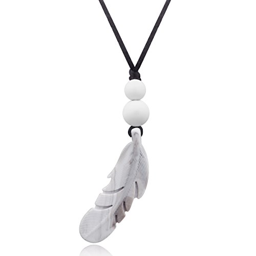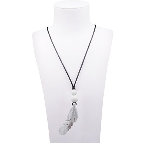 Designer Feather Teething Chew Beads Pendant Necklace for Female,Baby Chewbeads Necklace Teether Toys,100% Silicone BPA Free,15 Inches (Greyish white)