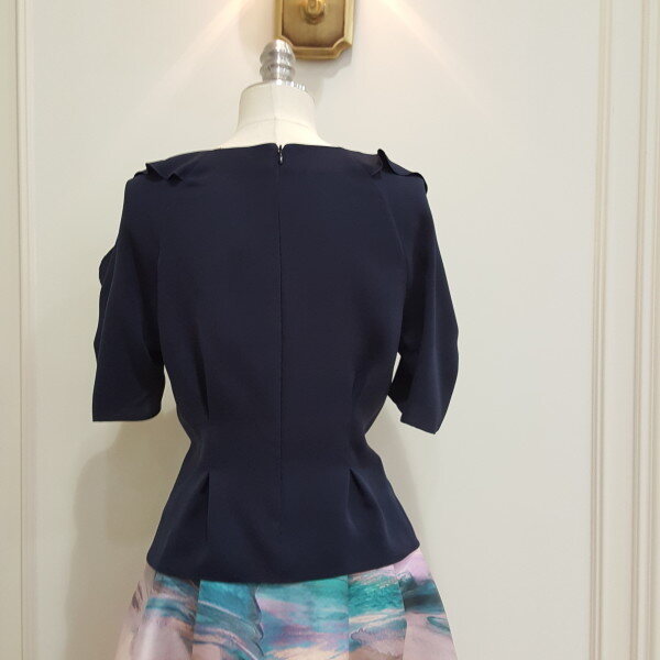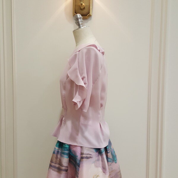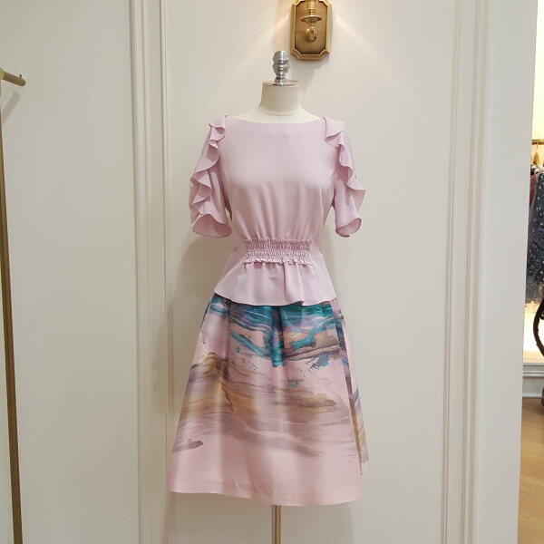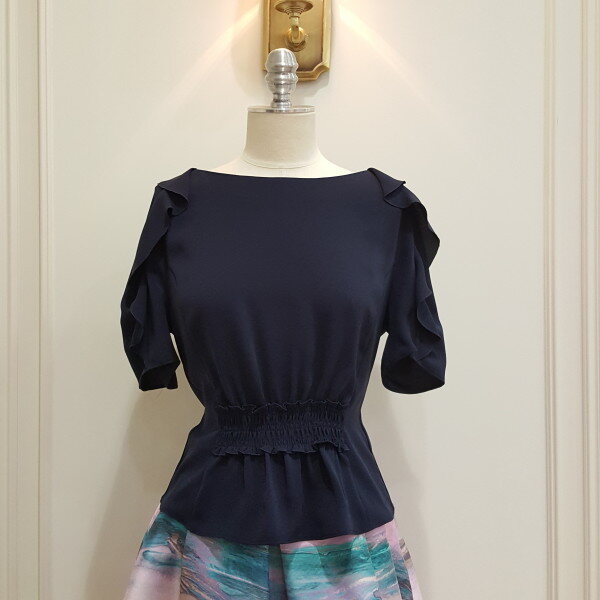 소매에 러플 디테일과 허리에 스모킹을 잡아 포인트를 준 블라우스.A라인 스커트와 코디 가능