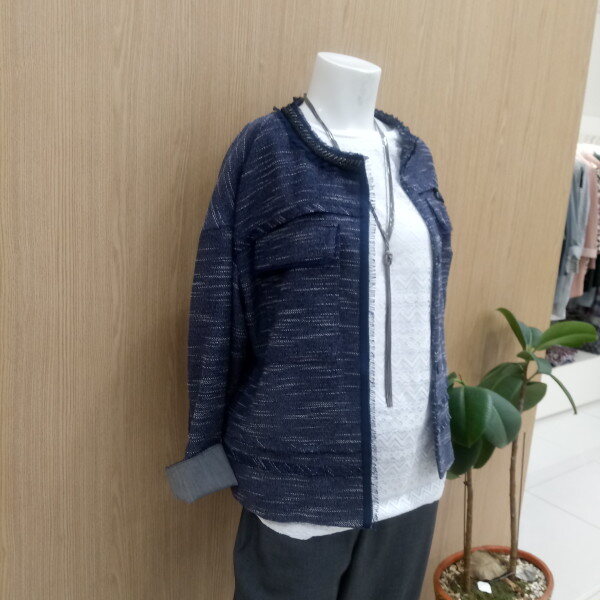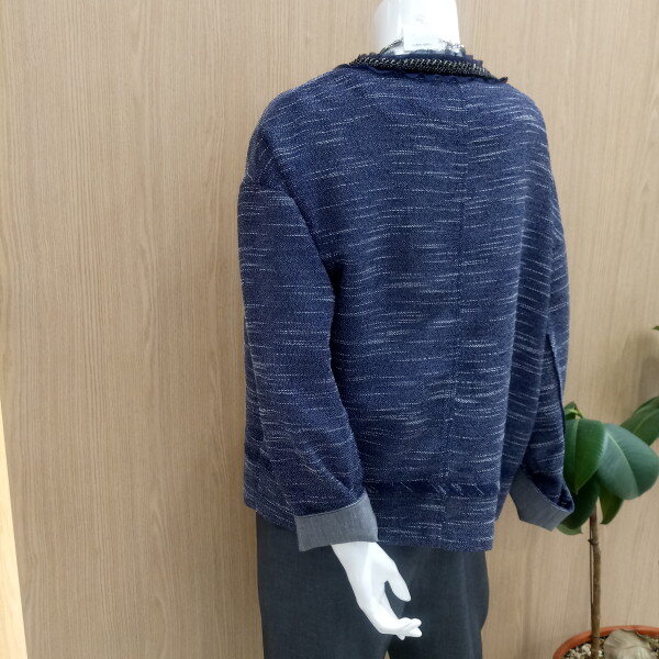 트위드숏재킷이에요 간절기부터 여름까지 착용하기 좋은 썸머 트위드 재킷으로 안감없는 숏한 길이감과 라운드 넥라인의 잔잔한 비즈장식이 여성스러워 보이네요~ 소매단 턴업시 톤온톤의 면데임으로 포인트를 준 베이직한 디자인의 아이템입니다.