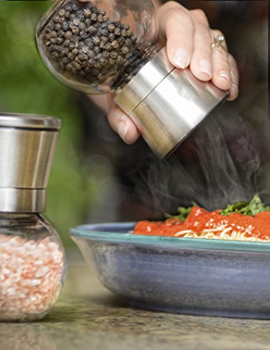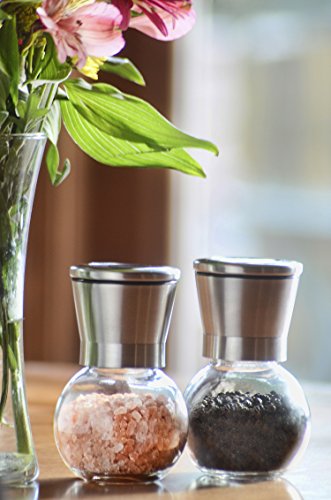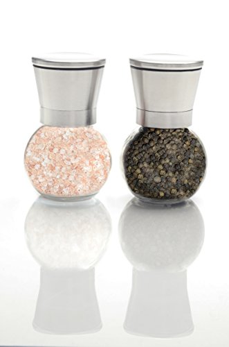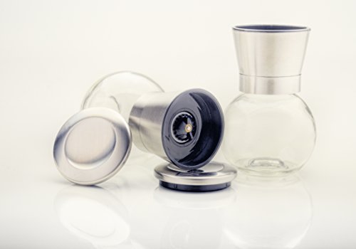 - Crafted with a mix of GLASS construction, BRUSHED SLEEK STAINLESS STEEL top, and a CERAMIC grinding mechanism. Measures: 5" tall by 2.5" wide. It is a durable blend of elegance and function. Not your typical salt and pepper shakers!