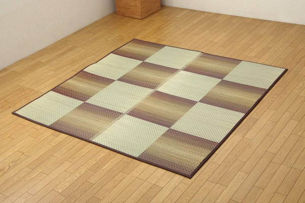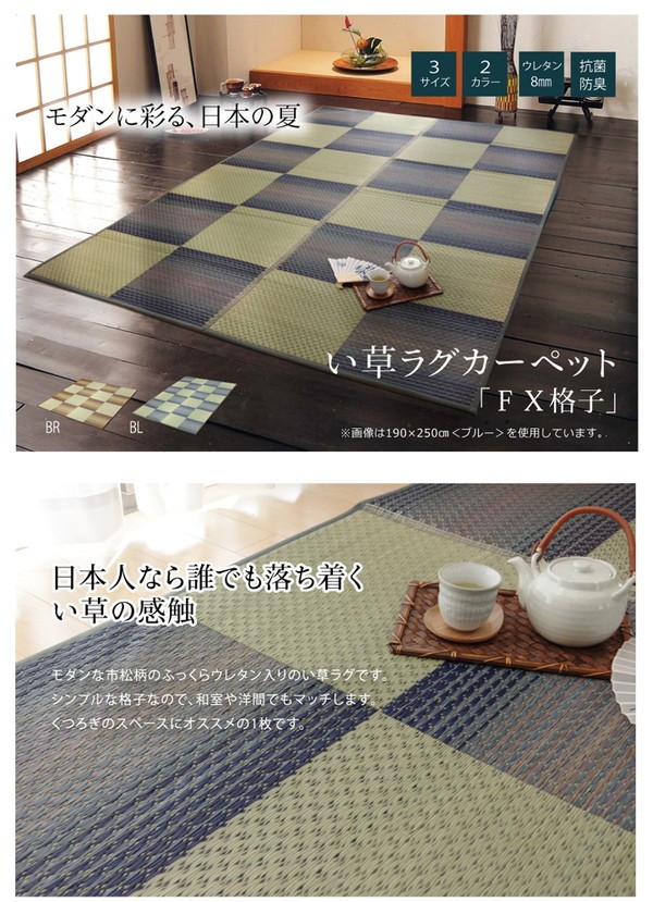 格子柄をデザインしたい草ラグです。シンプルで敷きやすくどんなお部屋にも合いやすい商品です。中材にはウレタンフォームを8mm使用し、ふっくらとしたふみ心地の商品です。フローリングでもご使用いただけるよう、底付き感を軽減してくれます。。またい草には空気の自然浄化作用、湿度の調節作用などがあります。こちらの商品はい草に青森ヒバ加工を施しています。(抗菌、防臭効果)