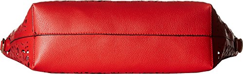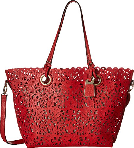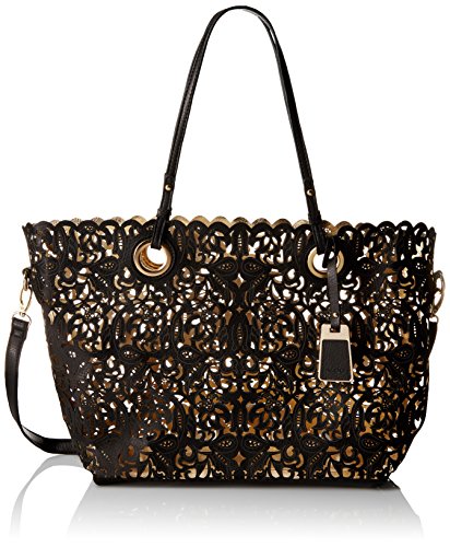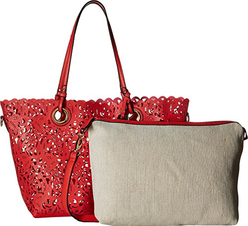 Large tote bag in laser-cut faux leather featuring coordinating removable zip-top pouch