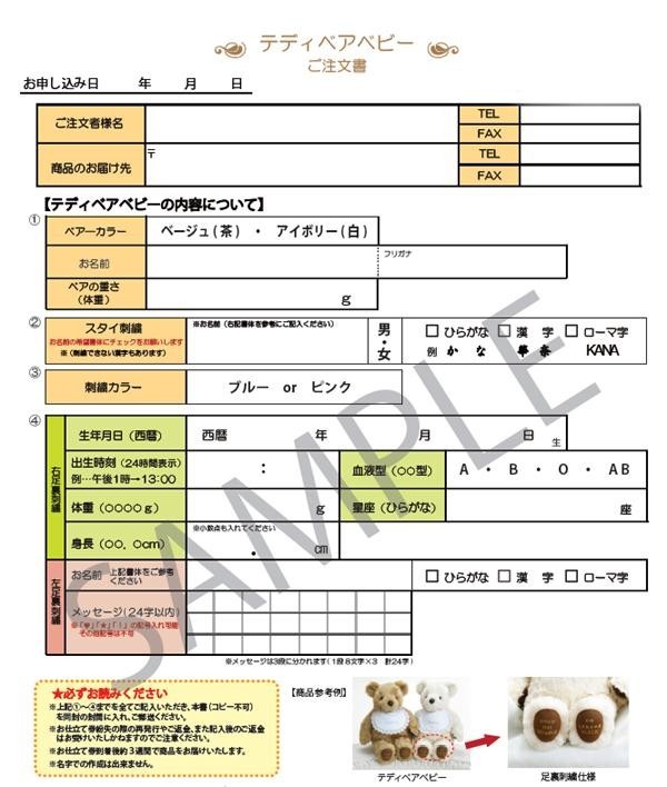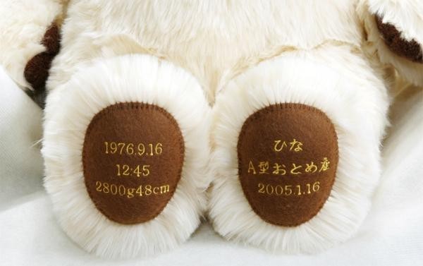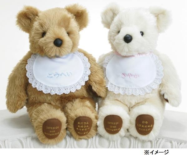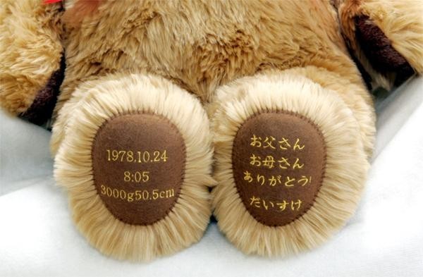| 赤ちゃんが生まれたときの重さでお作りする体重ベア。初めて赤ちゃんを抱き上げたときの感動を記念に残す事ができます。足の裏には、赤ちゃんのお名前、身長、体重、誕生日などを刺繍で入れることができます。 |