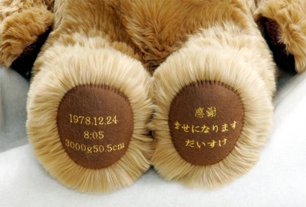 赤ちゃんが生まれたときの重さでお作りする体重ベア。初めて赤ちゃんを抱き上げたときの感動を記念に残す事ができます。足の裏には、赤ちゃんのお名前、身長、体重、誕生日などを刺繍で入れることができます。 |