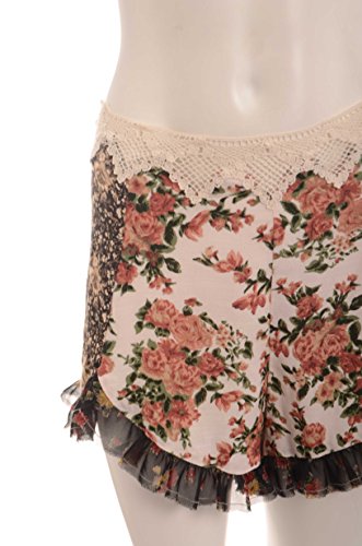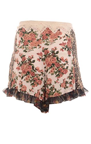 This skort by Free People features patchwork floral print, sheer lace trim, ruffled hem, concealed side zipper, no lining.