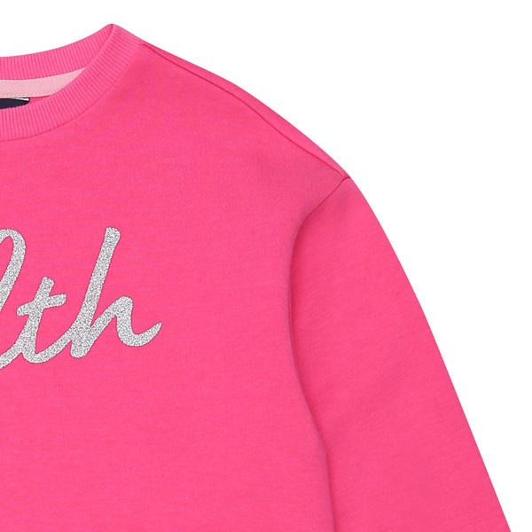 ●상품설명- 코튼 모달 특양면 소재로 터치감이 부드러운 여아 맨투맨 티셔츠. 가슴과 소매에 심플한 메탈나염으로 포인트를 준 스타일.