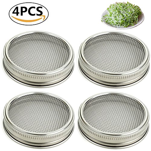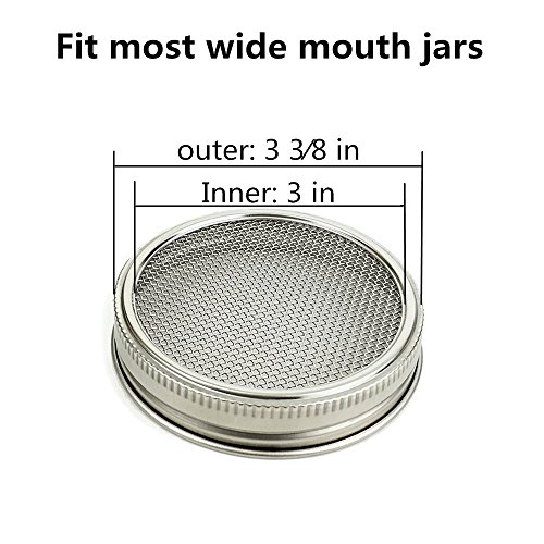 Stainless Sprouting Jar Lid Kit Turn your mason jar into a kitchen multi-tool! ? Size: WIDE MOUTH(3 in (76 mm) inner and 3 3?8 in (86 mm) outer diameter) ? At home, not only can you grow fresh buds, enjoy healthy green food,But also Straining:tea, tincture, juice, broth. Soaking:nuts, almond milk, seeds, legumes. Dusting:cocoa, sugar, flour, spices, seasonings, powder for the kitchen or any powder that need to be dusted on your garden, or pet ? Sprout Jar Lids "Jar Method"Sprouting Instructions: ? For a quart-sized jar, start with 1 1/2 table spoons seeds inside the jar, screw on the fine mesh sprouting lid and partially fill the jar through the sprout jar lids with warm water, not hot ? Swirl it around to clean the seeds, then pour out. Refill with warm water to cover at about 3 times their depth let soak overnight, away from light. This gets the germination process started ? Pour off the soak water. Find a location that is not exposed to direct sunlight. Place drained jar propped at angles allow any extra water to drain out. Turn the jar to spread out the seed. Cover the jar with the sprout jar lids and a dishtowel and leave for 3 to 4 hours. ? Rinse sprouts with cool, fresh water 2 or 3 times each day until they are ready to eat or refrigerate. When they begin to throw off the seed hulls, let the jar with sprout jar lids installed overflow with the water and the hulls will float out the top through the sprouting lid screen. Turn the jar to spread out the seed each time you rinse ? Pour the sprouts into a pan or sink of clean water. Skim off any remaining hulls that float to the surface. Other hulls will fall to the bottom of the container. Pull out the sprouts, gently shake off excess moisture and drain in a colander ? Package Included: 4 * Sprouting Jar Lid 0 |