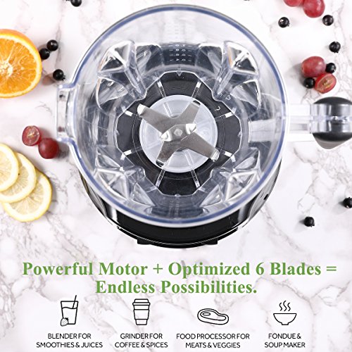 Professional Patented Design: Newest optimized 6 stainless steel thickened blades, which are designed with 2 horn sharp blades, 2 prolong sharp blades with upward end and 2 serrated sharp blades with downward end, prolong blades for grinding fully, upward & downward bending for crushing efficiently, not like other 6 blades design, ours completely finish no chunk under blades as well as shorten the time of crushing, let's enjoy the original taste of food.