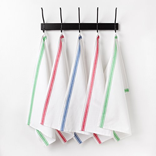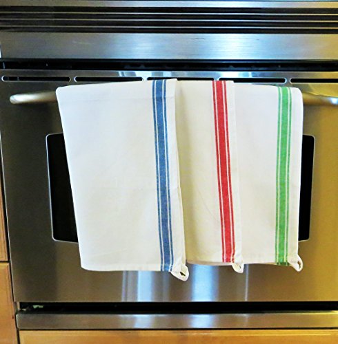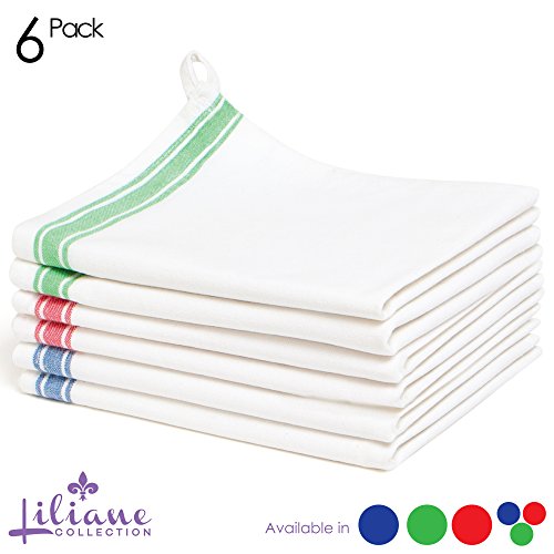 6 Kitchen Towels (18x28) - 100% Cotton - Vintage Design with Two Colorful Side Stripes. Classic Dish Towel Set Includes 2 Red Towels, 2 Green Towels & 2 Blue Towels. Absorbent with Hanging Loop.