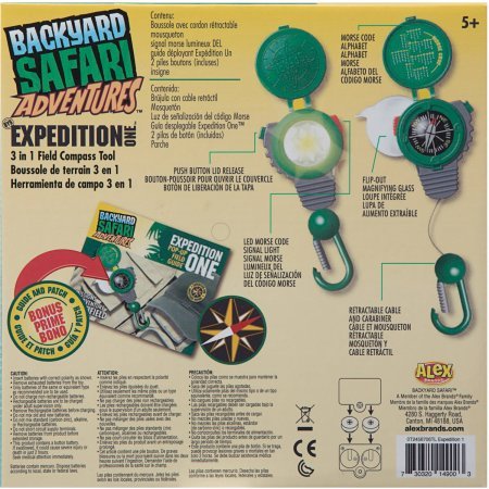 Studio : Backyard Safari Publisher : Backyard Safari Binding : Toy Product Description Backyard Safari Expedition One The Backyard Safari Expedition One 3-in-1 Field Compass will lead your child on his next outdoor adventure. This child's compass has a retractable carabiner to conveniently attach to your child's clothing. It features a flip-out magnifying glass for close up viewing, as well as a push button lid to reveal the field compass with easily marked directions. Magnifying lens folds out for close up study in the field - Age Range: 5 years and up,Includes unique 3-in-1 compass tool
