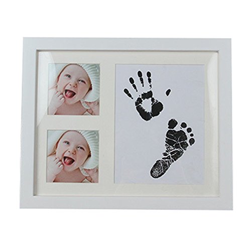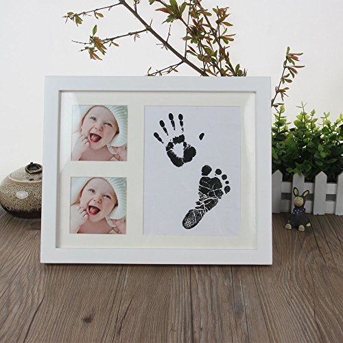 White wooden frame(28*23cm) with wide solid backstand is easily to place steadly. The size of ink pad is 16*12 cm that fits babies under 24 months and small pets. Photo insert holds two 7*7 cm photo.Make sure your photo fits before placing.