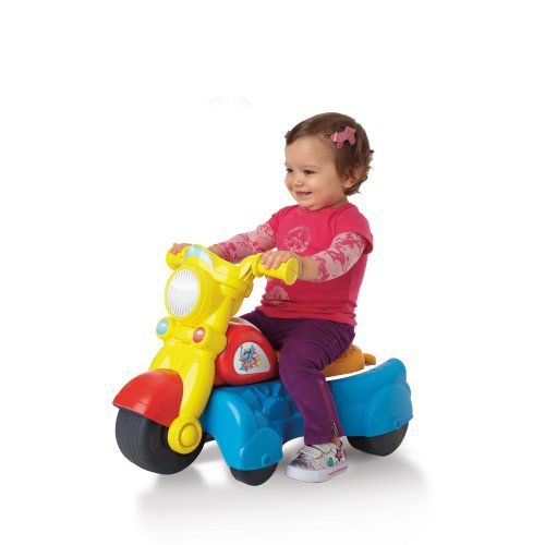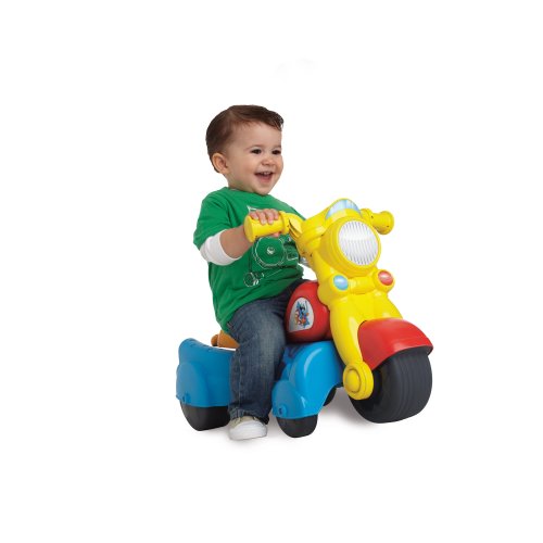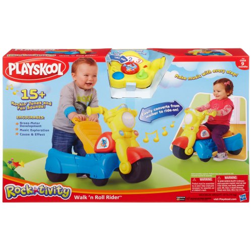 -. Binding : Toy -. Brand : Playskool -. Color : blue -. EAN : 0653569712091 -. Feature : Electronic Walk N Roll Rider toy features musical sounds and lights / Dashboard has beeping horn and revving engine key / Handlebars are easy to grasp and one side clicks / Maximum weight: 42 lb / More than 15 rocking tunes and fun sounds -. IsAdultProduct : 0 -. Label : Hasbro -. Manufacturer : Hasbro -. Model : 39938 -. MPN : 39938 -. NumberOfItems : 1 -. PackageQuantity : 1 -. PartNumber : 39938 -. ProductGroup : Toy -. ProductTypeName : TOYS_AND_GAMES -. Publisher : Hasbro -. Studio : Hasbro -. Title : Rocktivity Walk N Roll Rider, Blue -. UPC : 885145913817 -. Warranty : No Warranty
