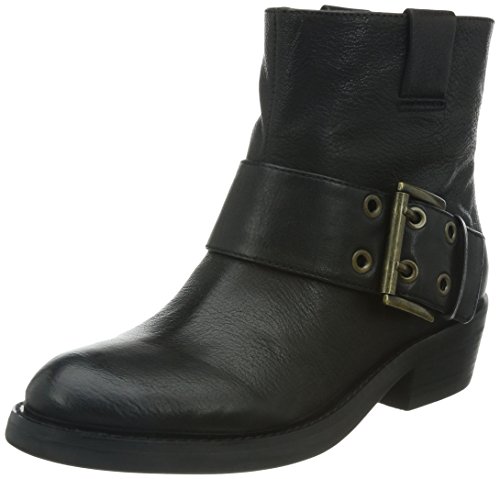 - Feature : Leather boot featuring adjustable buckle with metallic grommets and dual pull-on straps on shank